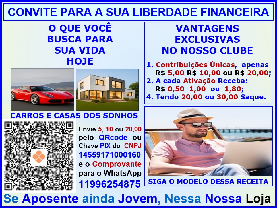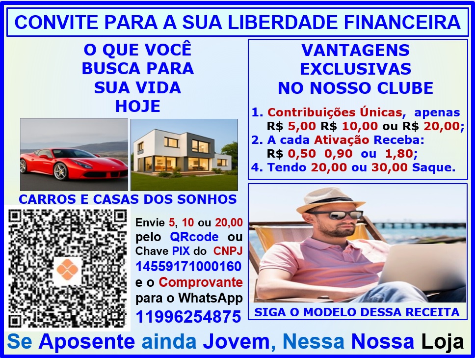 Copie o Número do nosso CNPJ 14559171000160 CLIQUE AQUI e verá toda nossa documentação e junto à Receita Federal CLIQUE AQUI no Link da Receita Federal e verá que estamos totalmente legalizada e atualizada na data que você acessar para fazer a consulta, o que significa que estamos PAGANDO EM DIA TODOS OS IMPOSTOS Municipal, Estadual e Federal, bem como os Saques dos nosso Sócios Consultores que estão Qualificados, até o final do dia da solicitação e será um prazer Diariamente Creditar no PIX cadastrado na conta da Sua Loja. Se ative e Qualifique-se o quanto antes para Receber seus Bônus ainda hoje.