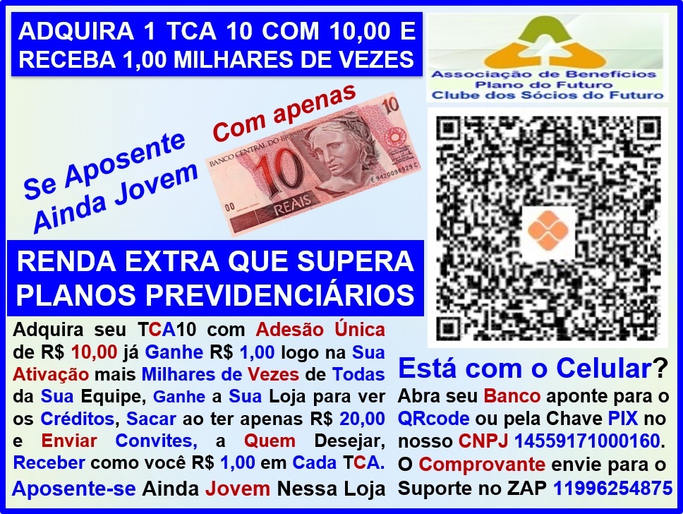 Faça o PIX abrindo seu banco e apontando ao QRcode abaixo ou pela chave CNPJ :-> 14559171000160 < ou mostrando esse QRCode, caso esteja sem PIX vá em qualquer Casa Lotérica do país depoisite e envie o comprovante para 11996254875 desse PIX para o Banco Gerencianet atual Efí Bank em Nome da Associação de Benefícios Plano do Futuro, envie o comprovante junto como o seu PIX poder Receber ao ficar Qualificado com apenas 3 Vendas Ativas.